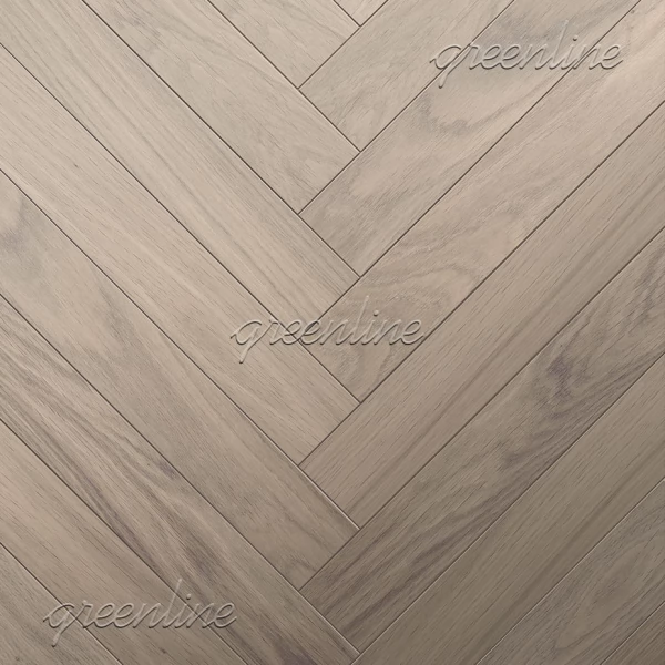 Инженерная доска GreenLine Дуб Софт (Страна производства Россия) из коллекции «Английская елка Extra» имеет серый рисунок, верхний слой сделан из благородного дерева дуб с селекцией «рустик».
