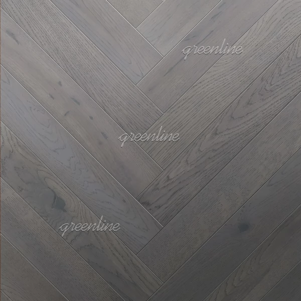 Инженерная доска GreenLine Рубикон (Страна производства Россия) из коллекции «Английская елка Matt» имеет темно-серый рисунок, верхний слой сделан из благородного дерева дуб с селекцией «кантри».
