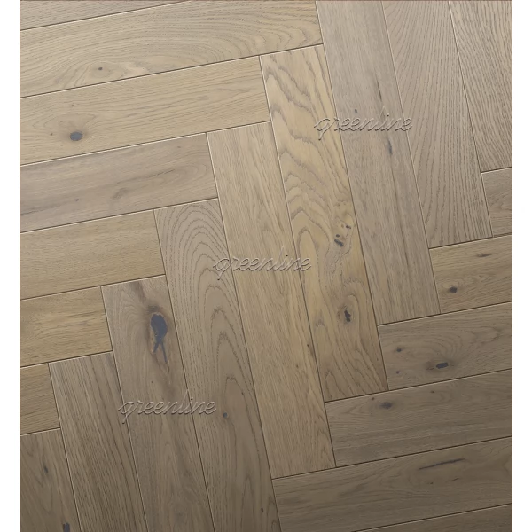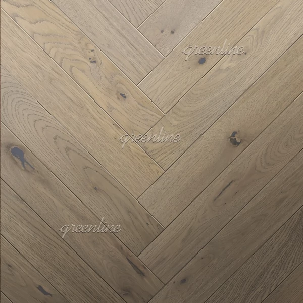 Инженерная доска GreenLine Сайма (Страна производства Россия) из коллекции «Английская елка Matt» имеет серо-коричневый рисунок, верхний слой сделан из благородного дерева дуб с селекцией «кантри».