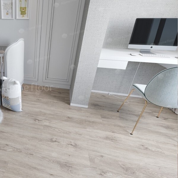 Каменный ламинат SPC Alpine Floor, цвет «Карите» из коллекции «Grand Sequoia Superior ABA», имеет серо-бежевый однополосный рисунок под дуб и 43 класс нагрузки.