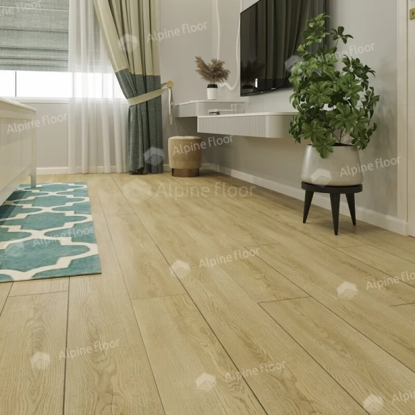 Замковый SPC ламинат Alpine Floor производства Китай с фаской, что предотвращает плиту напольного покрытия от повреждений на стыках.