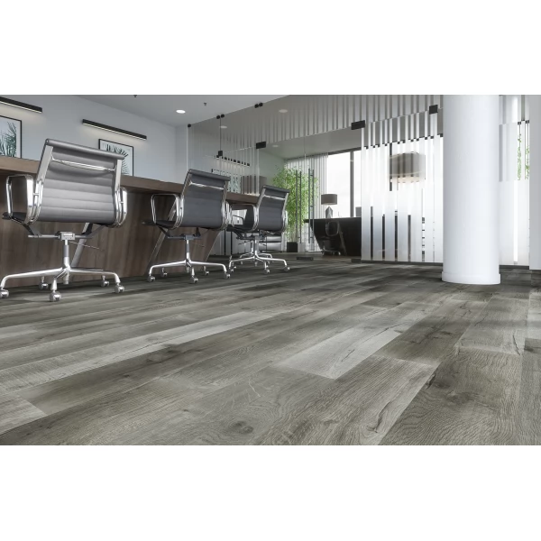 Каменный ламинат SPC Fargo, цвет «Дуб Токио» из коллекции «Classic», имеет серый однополосный рисунок под дуб и 41 класс нагрузки.