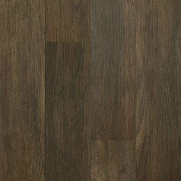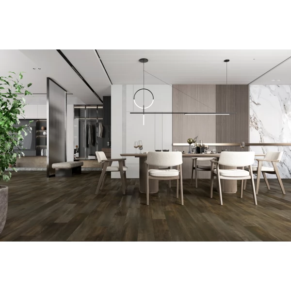 Каменный ламинат SPC Fargo, цвет «Орех Маньчжурский» из коллекции «Classic», имеет темно-коричневый однополосный рисунок под орех и 41 класс нагрузки.