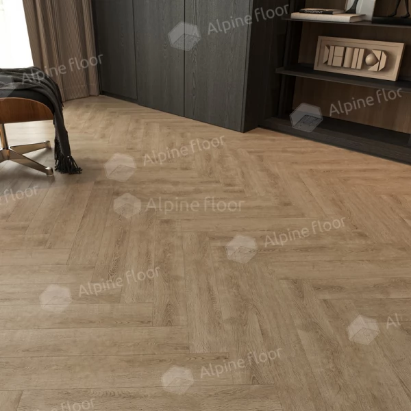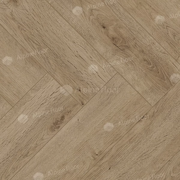 Ламинат Alpine Floor, цвет «Дуб Прованс» из коллекции «Herringbone 8», имеет натуральный английская елка рисунок под дуб и 33 класс нагрузки.