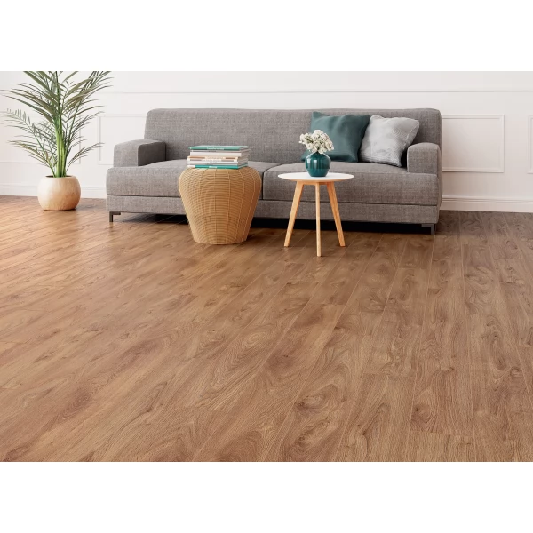 Ламинат Camsan, цвет «Дуб Аси» из коллекции «Avangard», имеет коричневый однополосный рисунок под дуб и 32 класс нагрузки.