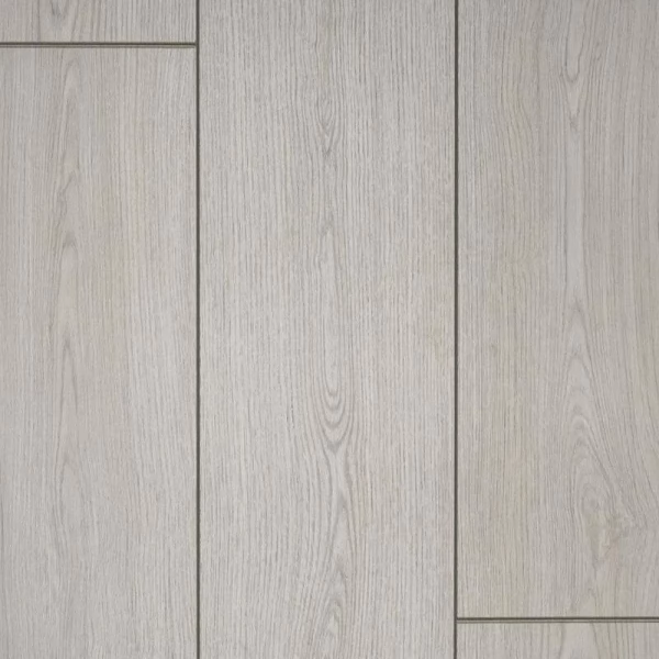 Ламинат Ever, цвет «Дуб Каселла белый» из коллекции «Sense», имеет серый однополосный рисунок под дуб и 34 класс нагрузки.