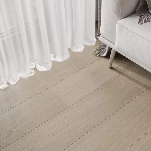 Ламинат Ever, цвет «Дуб Виктория натуральный светлый» из коллекции «Sense», имеет бежевый однополосный рисунок под дуб и 34 класс нагрузки.