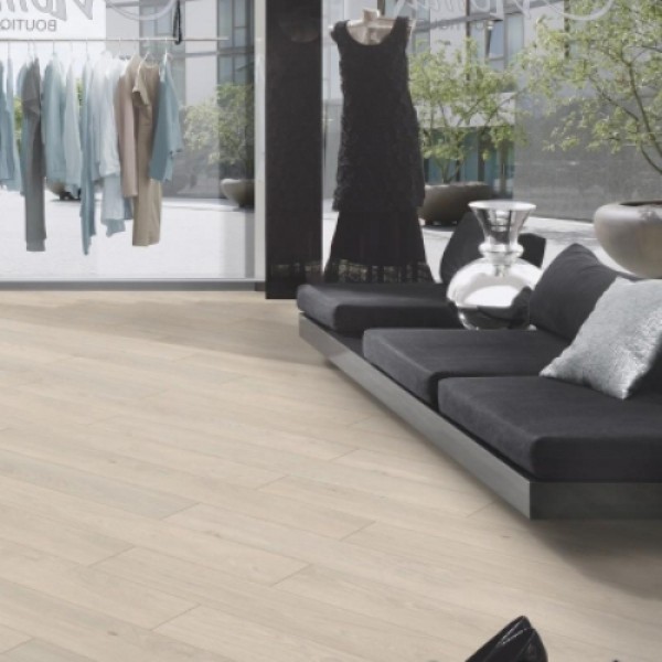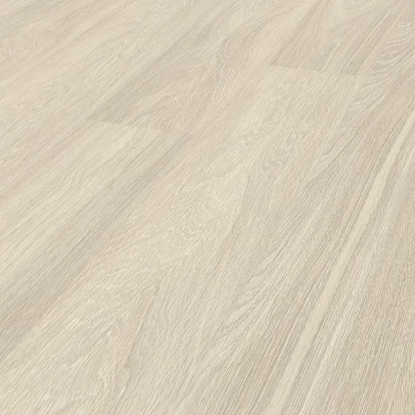 Ламинат Kronospan, цвет «Дуб Снежный» из коллекции «Variostep Classic», имеет кремовый однополосный рисунок под дуб и 32 класс нагрузки.