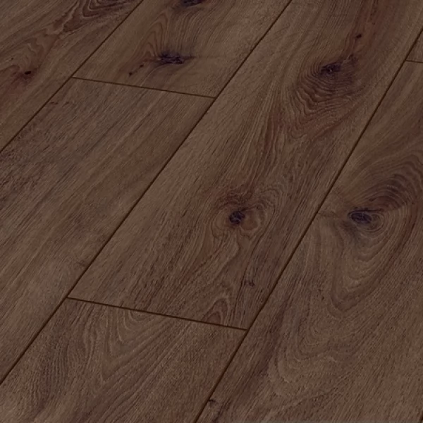Ламинат Kronotex, цвет «Дуб Престиж темный» из коллекции «Amazone», имеет коричневый однополосный рисунок под дуб и 33 класс нагрузки.
