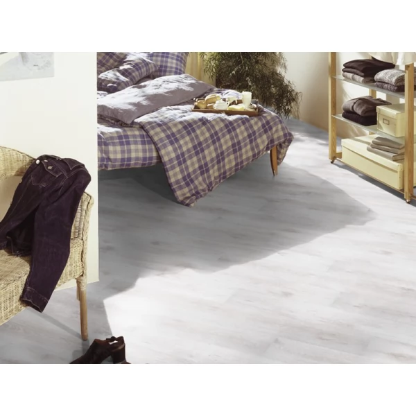 Ламинат Kronotex, цвет «Дуб Белый» из коллекции «Berlin», имеет белый трехполосный рисунок под дуб и 32 класс нагрузки.