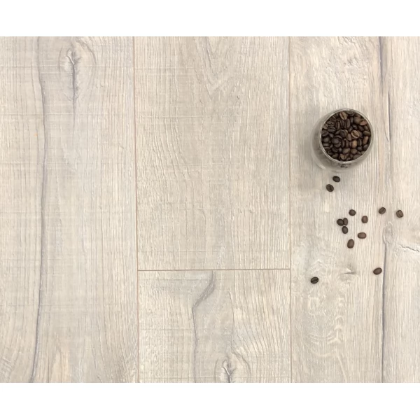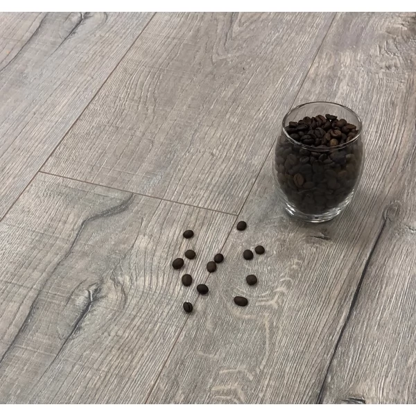 Ламинат LOC Floor, цвет «Старый серый дуб брашированный» из коллекции «Plus», имеет светло-серый однополосный рисунок под дуб и 33 класс нагрузки.