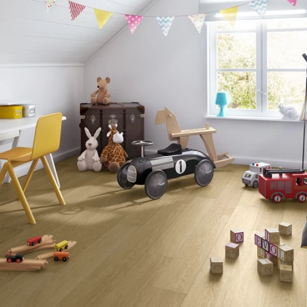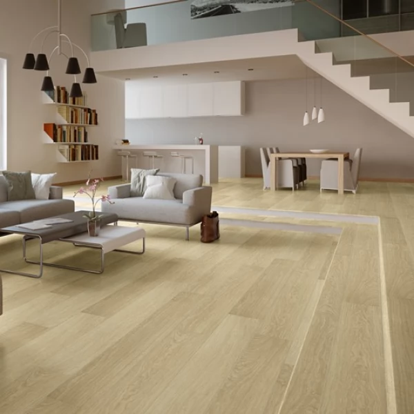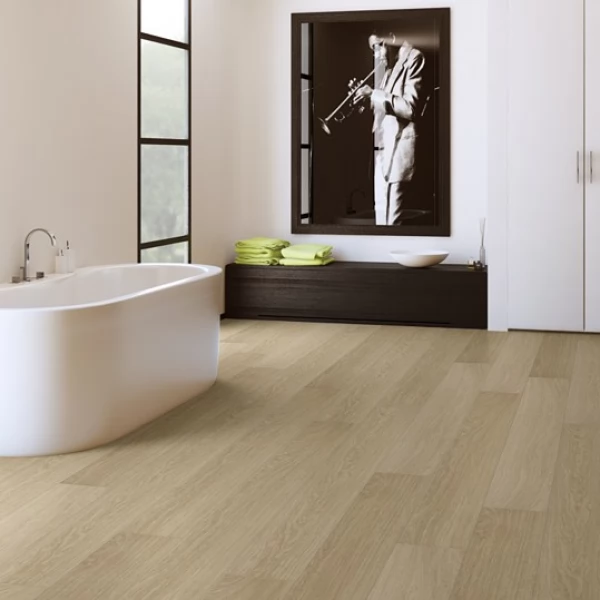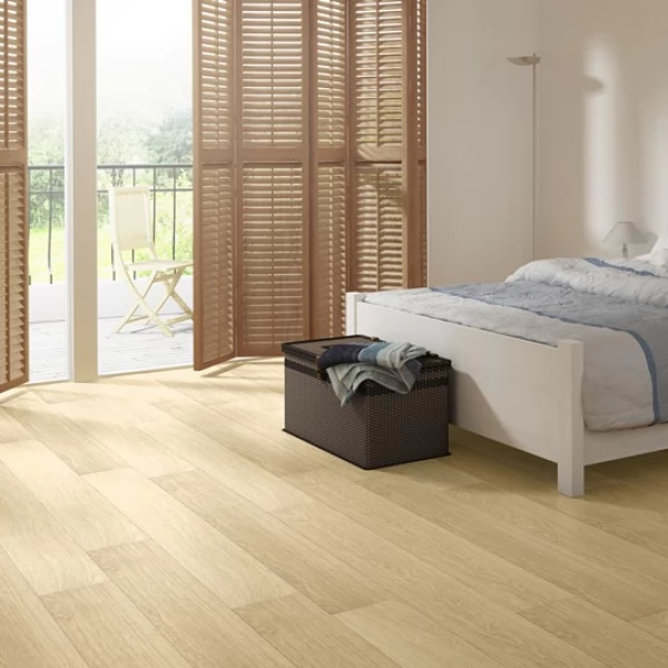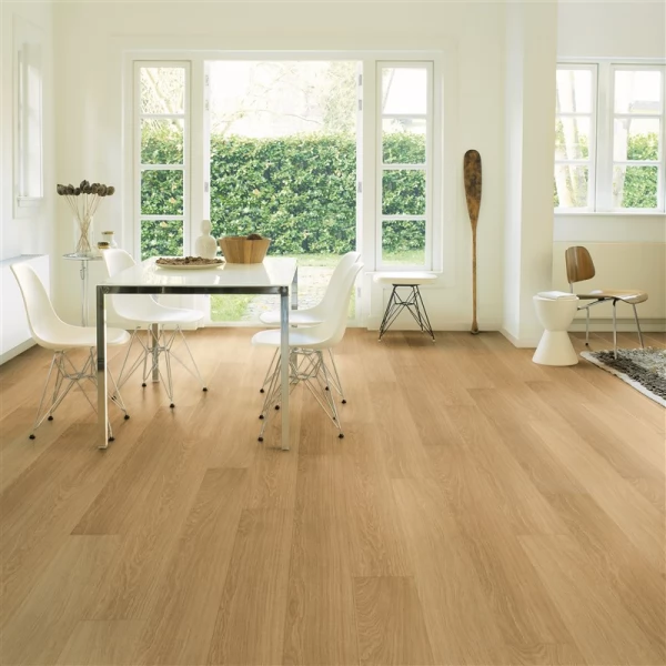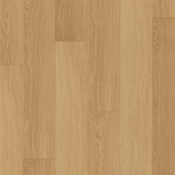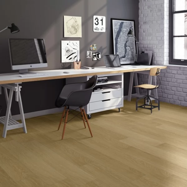 Ламинат Quick-Step, цвет «Доска натурального дуба Лак» из коллекции «Impressive», имеет натуральный однополосный рисунок под дуб и 32 класс нагрузки.