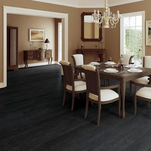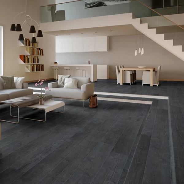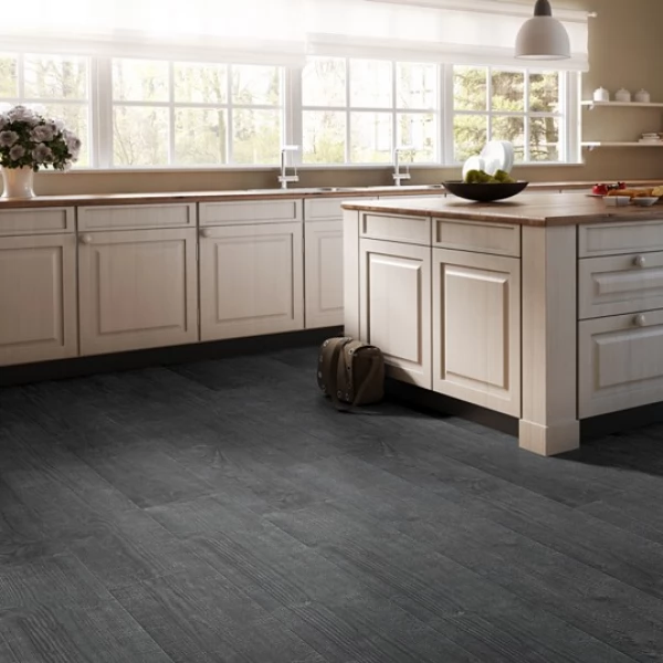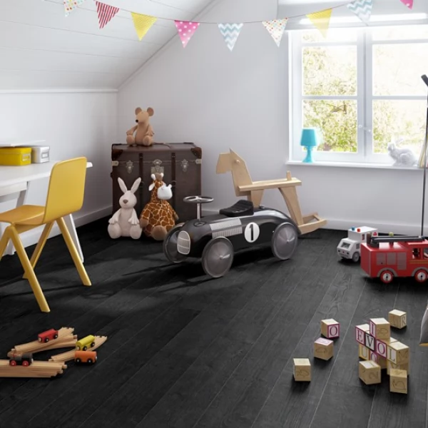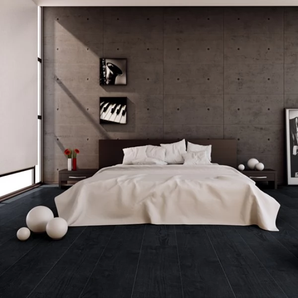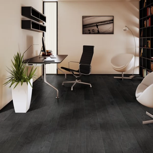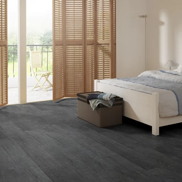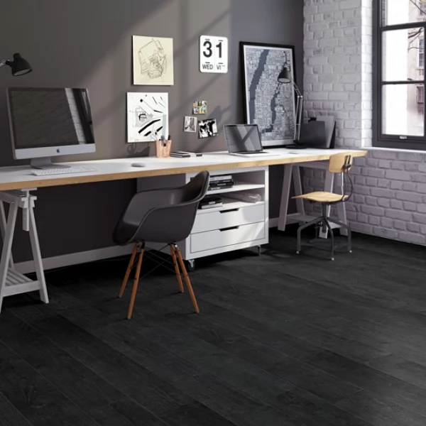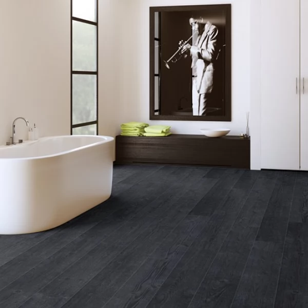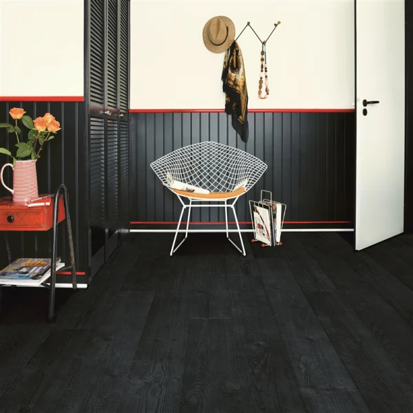 Ламинат Quick-Step, цвет «дуб Чёрная Ночь» из коллекции «Impressive», имеет чёрный однополосный рисунок под дуб и 32 класс нагрузки.