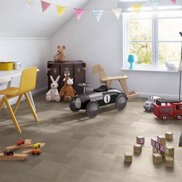 Ламинат Quick-Step, цвет «Плитка темная» из коллекции «Exquisa», имеет коричневый под камень рисунок под и 32 класс нагрузки.
