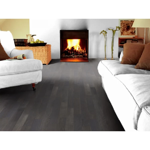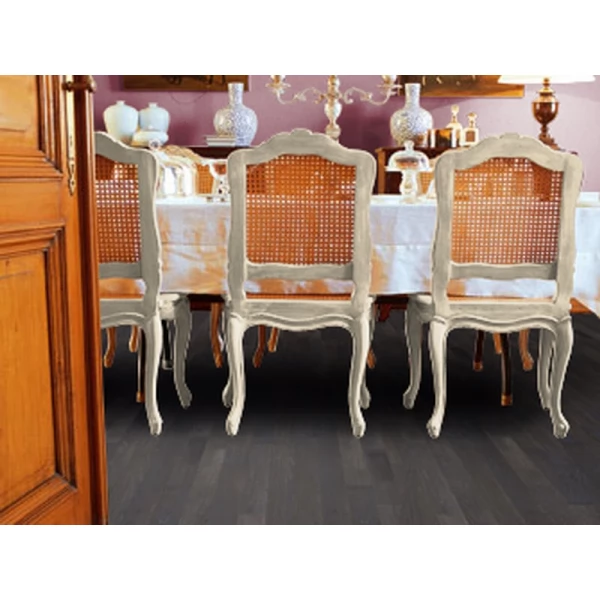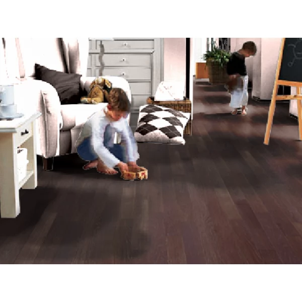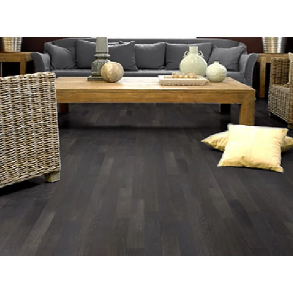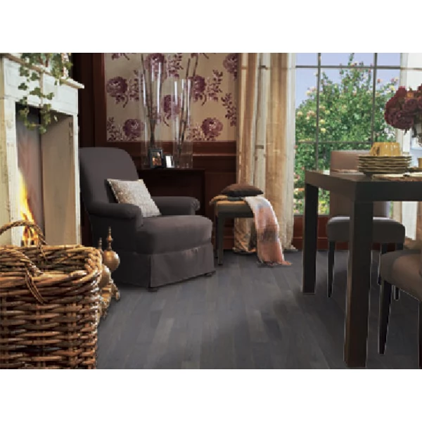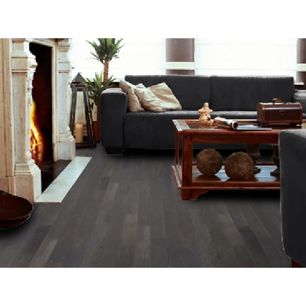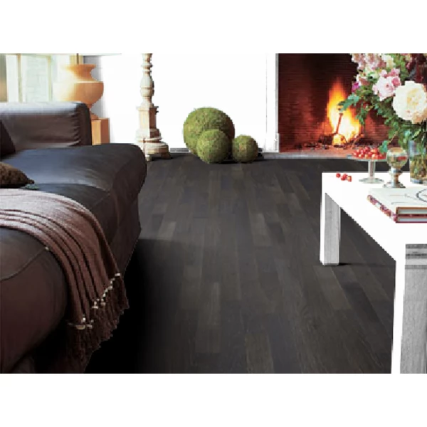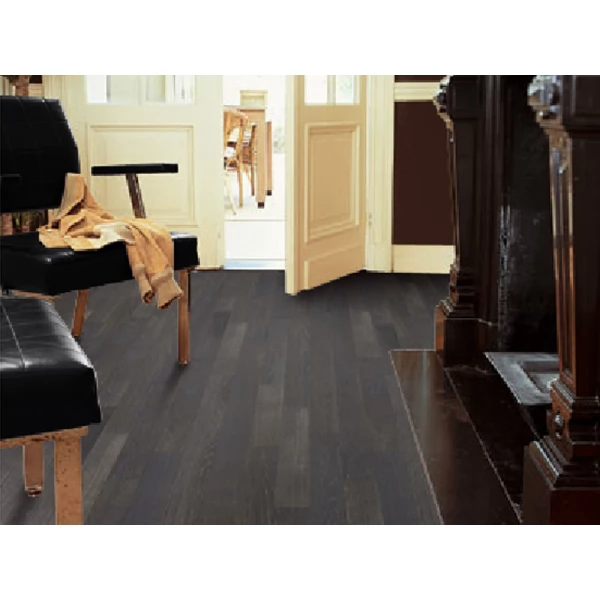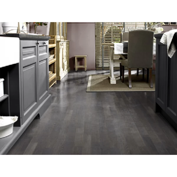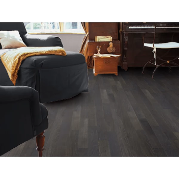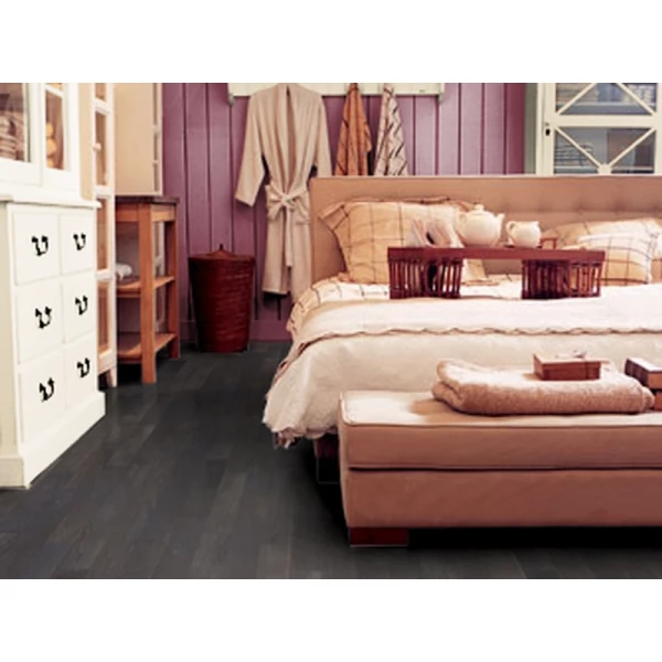 Ламинат Quick-Step, цвет «дуб французский чёрный лакированный» из коллекции «Linesse», имеет чёрный однополосный рисунок под дуб и 32 класс нагрузки.