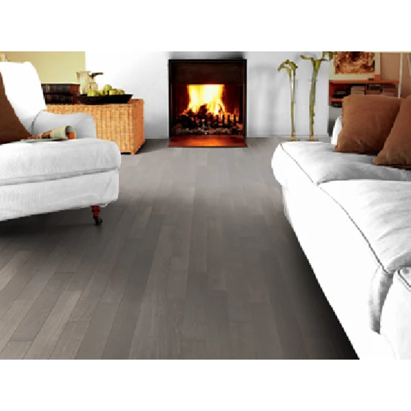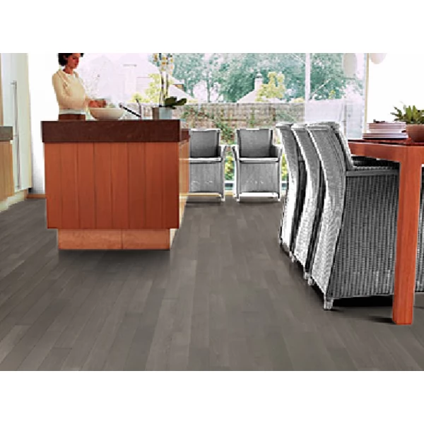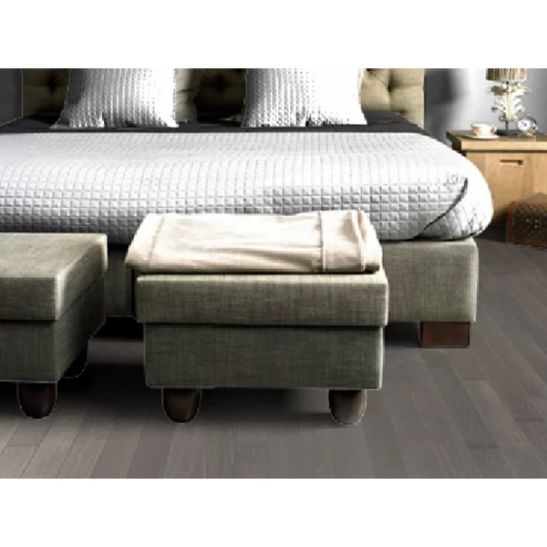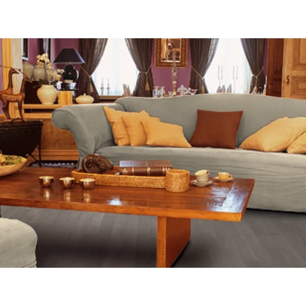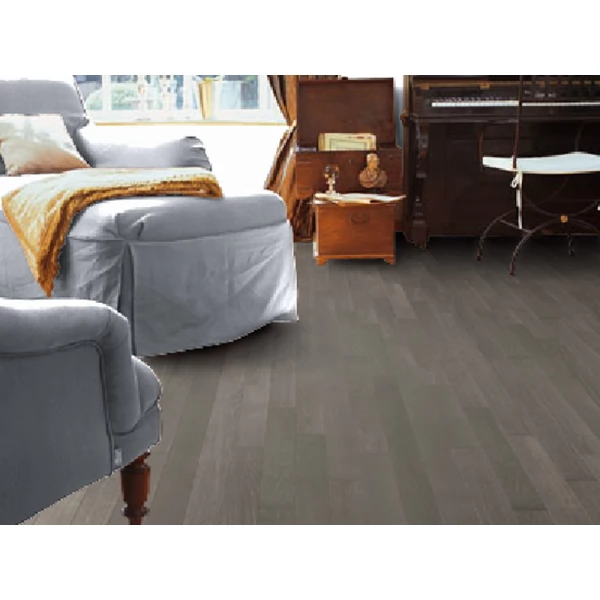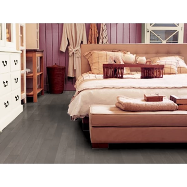 Ламинат Quick-Step, цвет «дуб французский серый лакированный» из коллекции «Linesse», имеет серый однополосный рисунок под дуб и 32 класс нагрузки.
