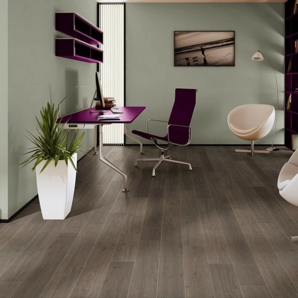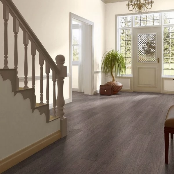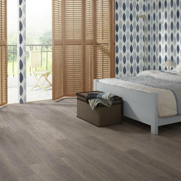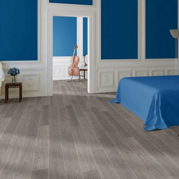Ламинат Quick-Step, цвет «дуб серый лакированный» из коллекции «Perspective», имеет серый однополосный рисунок под дуб и 32 класс нагрузки.