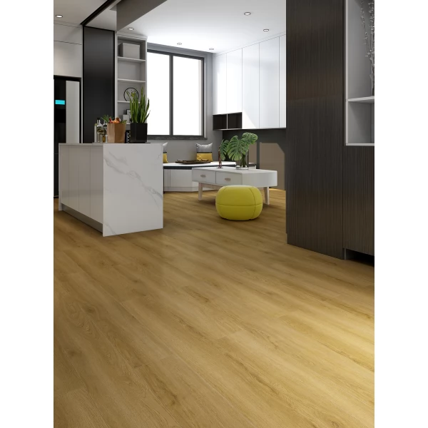 Каменный ламинат SPC Hoi Lock Flooring, цвет «Женьшень» из коллекции «Pekin», имеет светло-коричневый однополосный рисунок под дуб и 43 класс нагрузки.