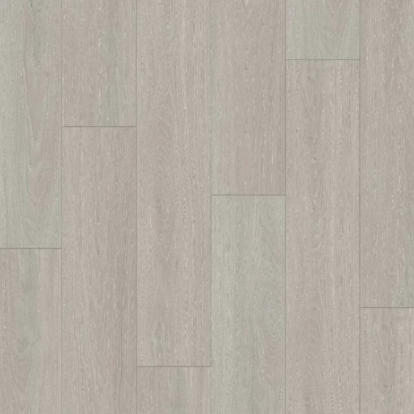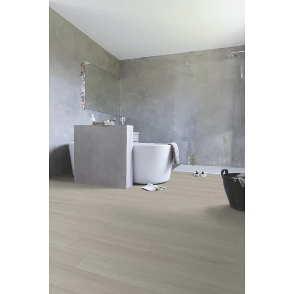 Каменный ламинат SPC Quick-Step Vinyl SPC, цвет «Дуб светло-серый» из коллекции «Atmosphere», имеет светло-серый однополосный рисунок под дуб и 33 класс нагрузки.