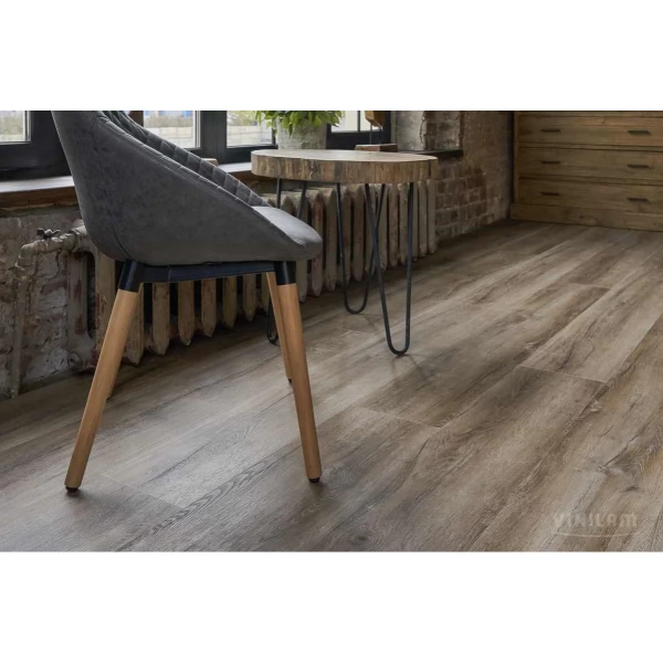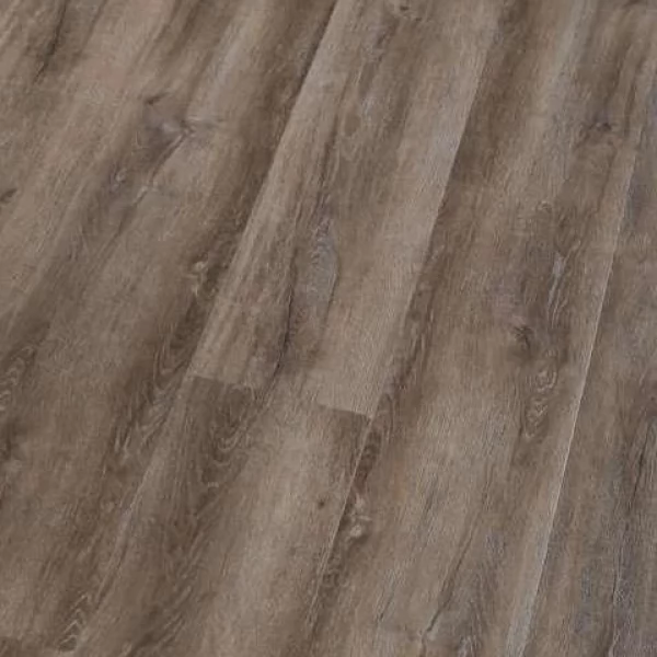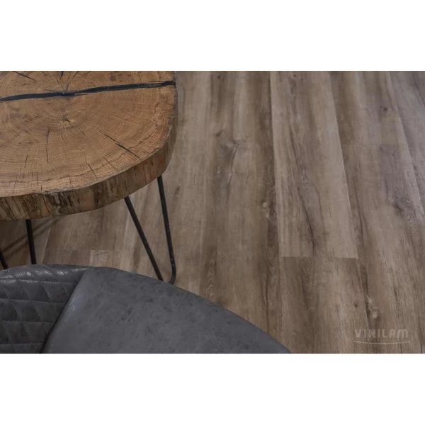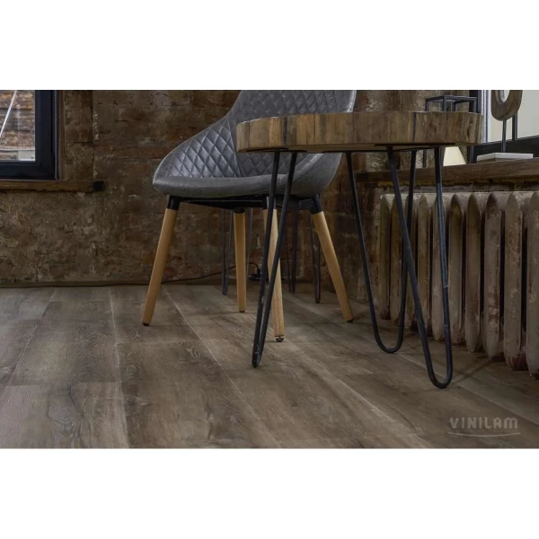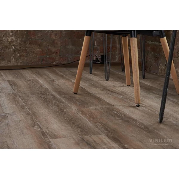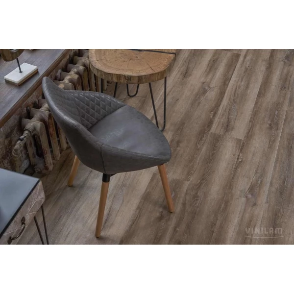 Каменный ламинат SPC VinilAm, цвет «Дуб Биль» из коллекции «Ceramo XXL замковый», имеет коричневый однополосный рисунок под дуб и 43 класс нагрузки.