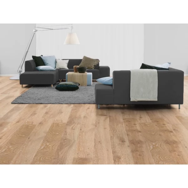 Паркетная доска Karelia «дуб stonewashed ivory» (Страна производства Финляндия) из коллекции Однополосная имеет выбеленный однополосный рисунок, верхний слой сделан из благородного дерева дуб с селекцией «натур».