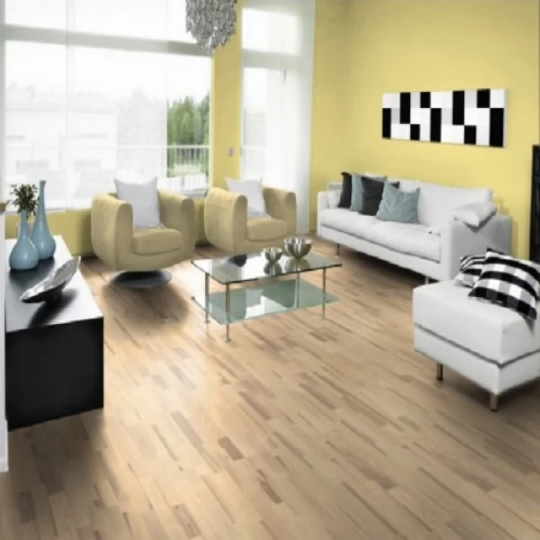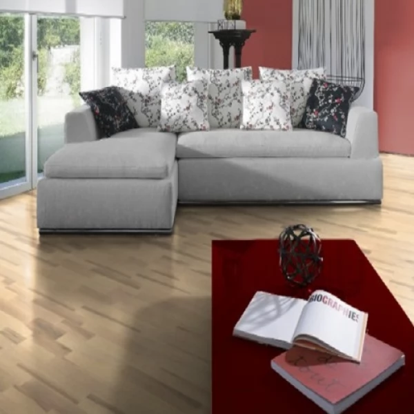 Паркетная доска легко укладывается и отлично подходит для помещений с теплым полом. Замковый тип соединения без фаски обеспечивает надежное сцепление.
