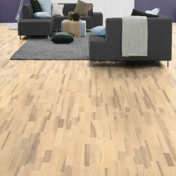 Паркетная доска Karelia «Ясень Country Vanila matt» (Страна производства Финляндия) из коллекции Трехполосная имеет выбеленный трехполосный рисунок, верхний слой сделан из благородного дерева ясень с селекцией «кантри».