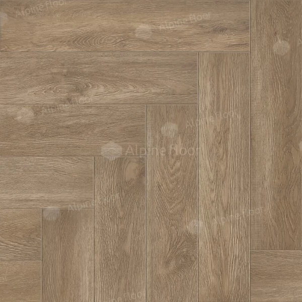 Плитка ПВХ (LVT) Alpine Floor, цвет «Макадамия» из коллекции Parquet LVT, имеет коричневый однополосный рисунок под дуб и 43 класс нагрузки.