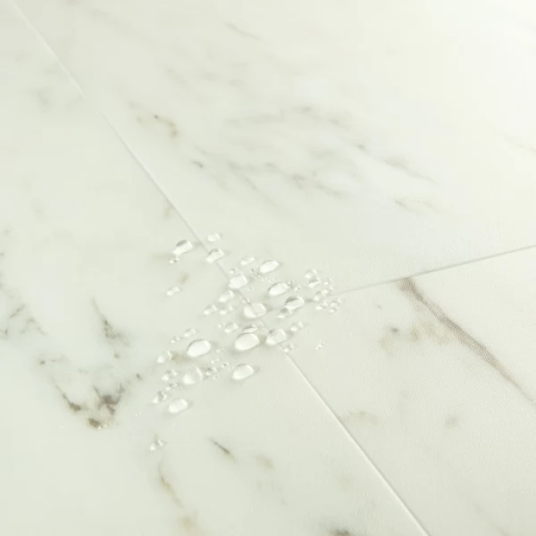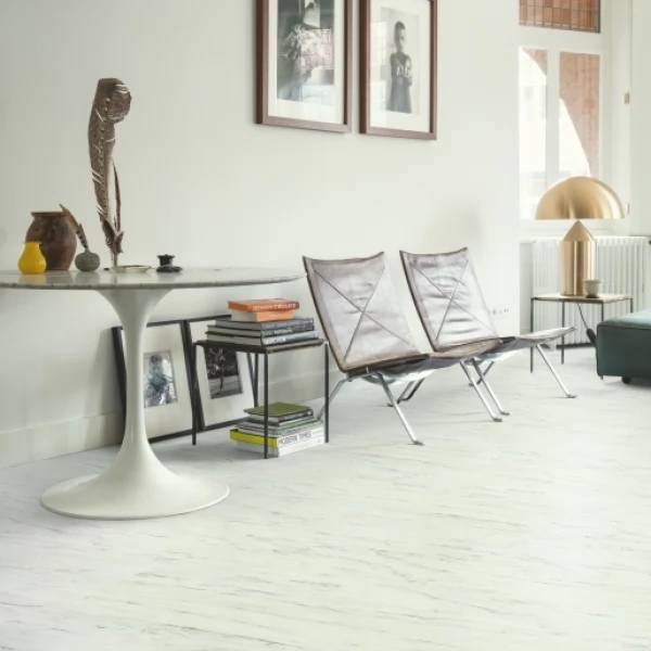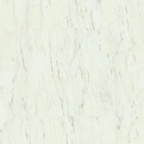 Плитка ПВХ (LVT) Quick-Step Vinyl Flex, цвет «Мрамор белый лунный» из коллекции Blush, имеет белый рисунок под под камень и 33 класс нагрузки.