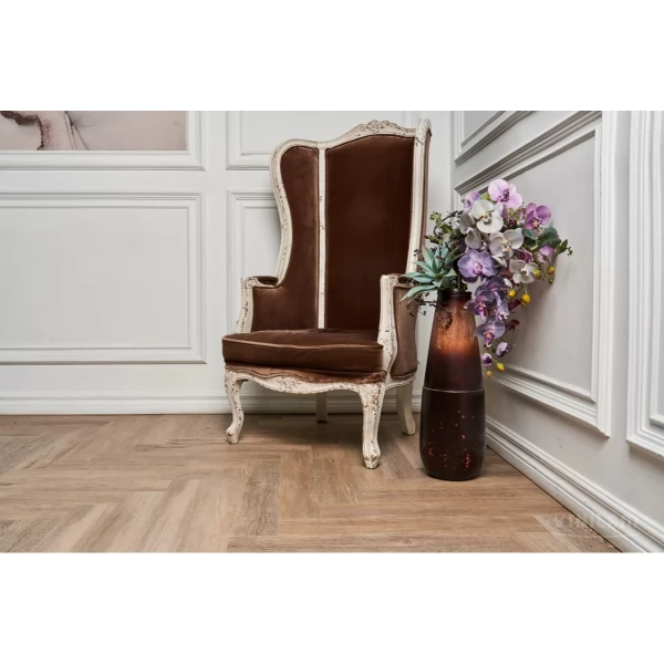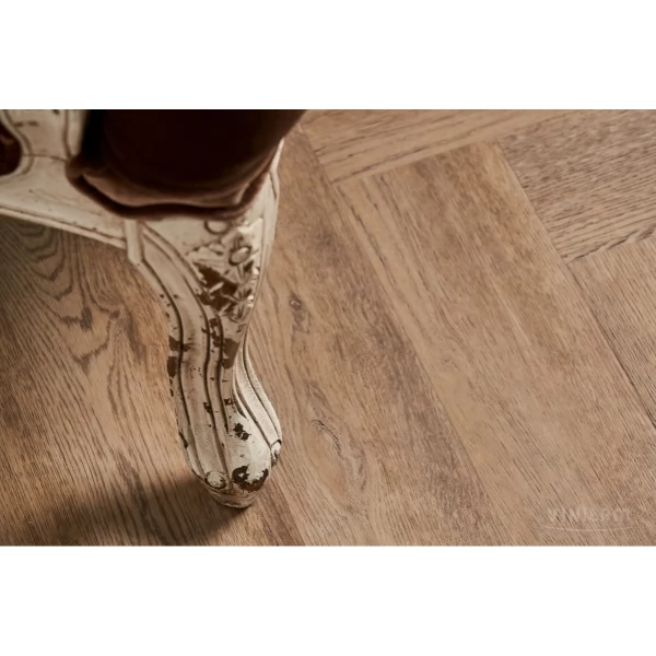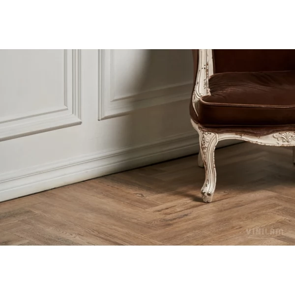 Плитка ПВХ (LVT) VinilAm, цвет «Паркет Северный» из коллекции Parquet Herringbone клеевой, имеет светло-коричневый английская елка рисунок под дуб и 43 класс нагрузки.